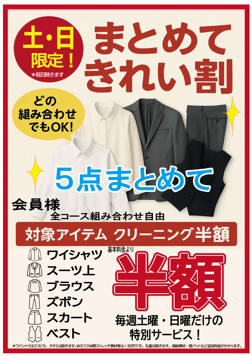 土・日限定(祝日を除く)で対象アイテムを 5点まとめてクリーニング半額!