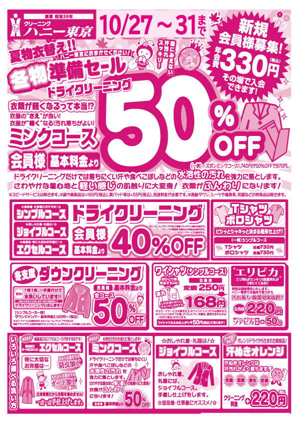 • ダウンクリーニング(全コース) … 会員様 50%OFF
