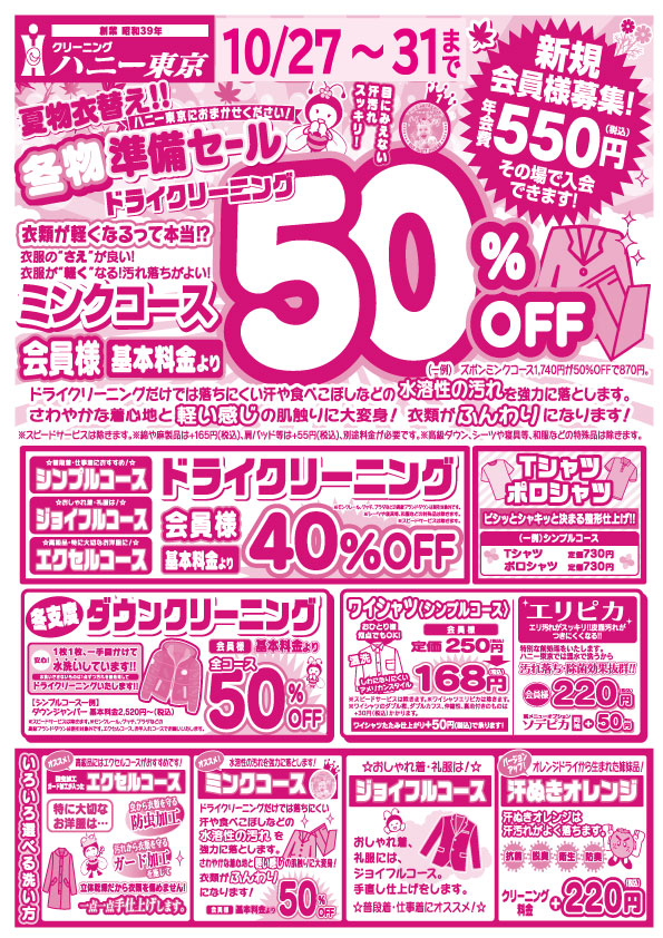• ダウンクリーニング(全コース) … 会員様 50%OFF